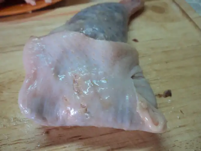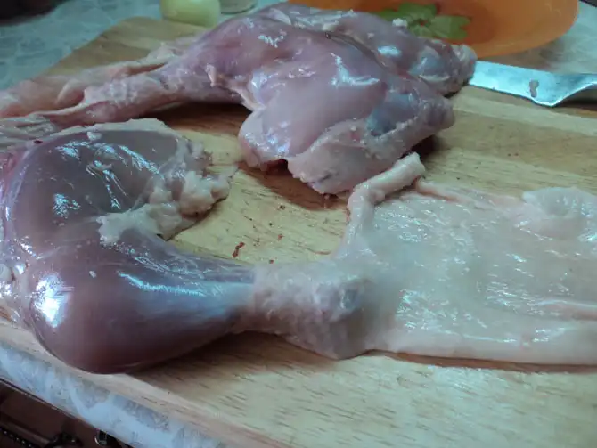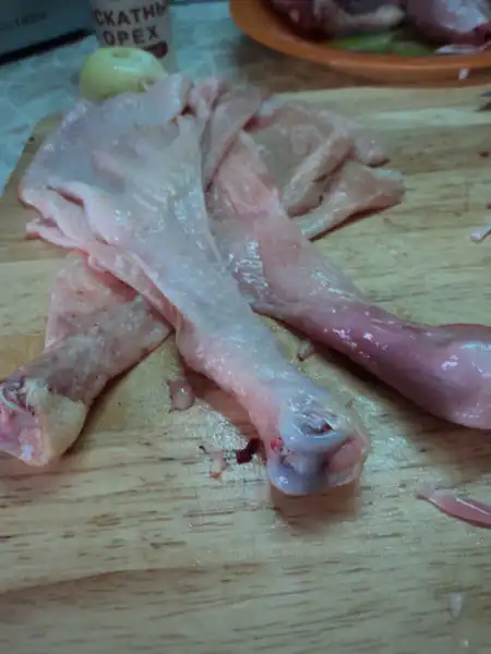 «Раздеваем» куриные окорока. Все просто, но нужно быть аккуратнее, чтобы кожицу не порвать. Стягиваем ее чулком. Там, где снимается с трудом, поддеваем слега острием ножа. Должно получиться так.