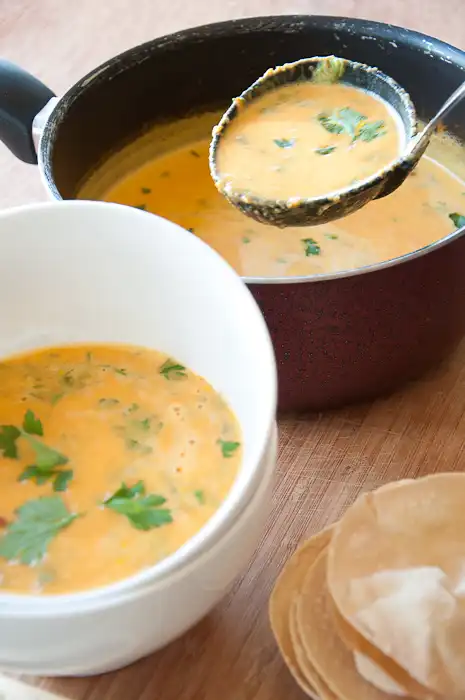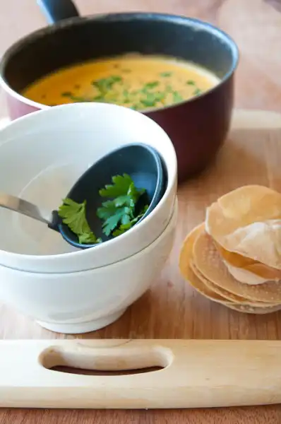 При некоторой странности сочетания продуктов - апельсина, бобовых, моркови, имбиря, кокосового молока и индийских специй - получается совершенно восхитительный, легкий и острый (впрочем, остроту можно регулировать) и очень красивый суп.