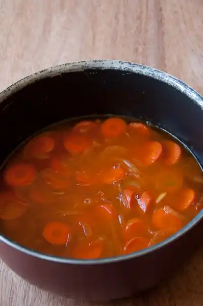 Добавить сок одного апельсина и бульон и довести до кипения. Варить на медленном огне 10 минут, пока морковь не станет мягкой, затем влить кокосовое молоко. Снять с огня, пюрировать с помощью блендера.