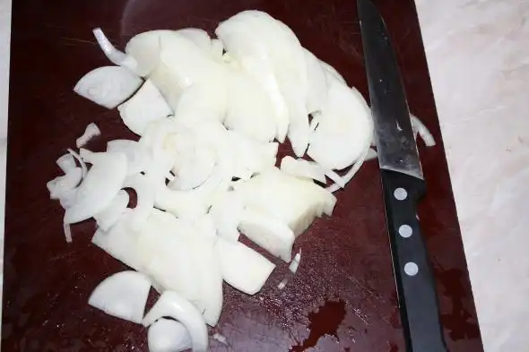Пока обжаривается лук, открываем грибы и мелко режем свинину...