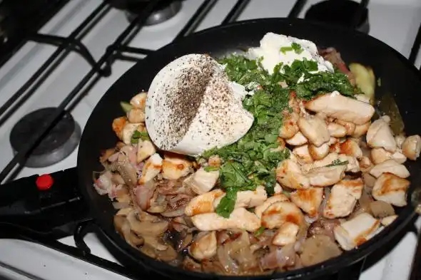 Кусочки филе обжариваем до золотистой корочки на сильном огне и соединяем с остальными ингредиентами...