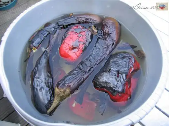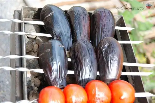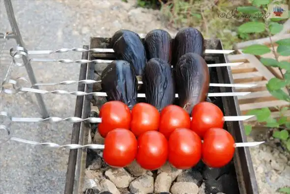 Пока у нас разгораются угли, мы на них сможем запечь наши овощи, до образования черноты на баклажанах и перцах и лопнувшей кожи на помидорах.