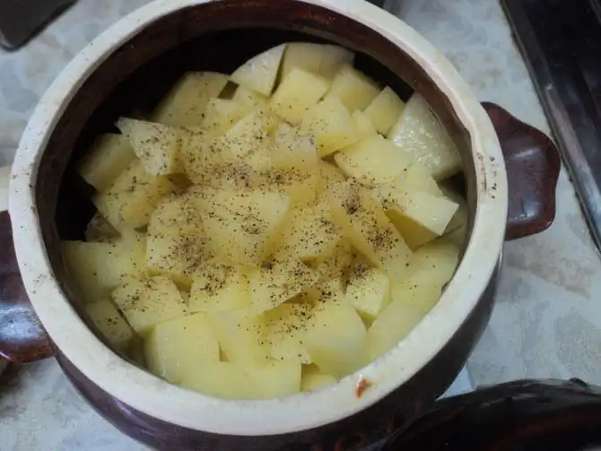 Смазываем внутренние стенки горшочков растительным маслом. Ставим разогревать духовку до 200 градусов. Дальше выкладываем наши ингредиенты в следующей последовательности: лук, мясо, картофель. Картофель посыпаем специями и солью (в моем случае это просто молотый черный перец)