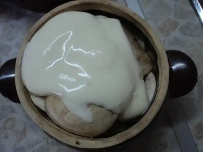 Выкладываем в каждый горшочек по 2 ложки сметаны. Накрываем крышкой и ставим в разогретую духовку. Убавляем духовку до 180 градусов. Оставляем минут на 40. Выключаем духовку. Пусть горшки постоят еще 10–15 минут. Эти горшки очень здорово сохраняют тепло. Вы уже их вытащили, а жаркое все еще «доходит»