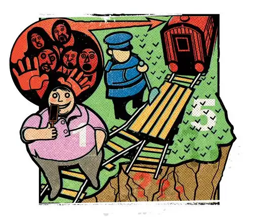 Условие: Опять отцепившийся вагон угрожает жизни пяти человек. Но поезд проходит под мостом, на перилах которого сидит толстяк. Если сбросить его перед вагоном, тот затормозит, и все пятеро будут живы.
