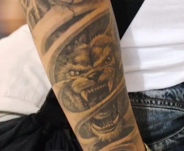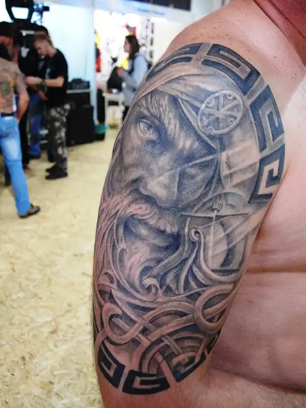На одной руке Перун, а на другой - портрет хозяина татуировки, чего уж там