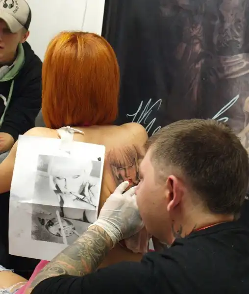 Есть приятные моменты в работе у татуировщка, не так ли. Надо думать, девушка решила увековечить свое лицо еще и на спине.