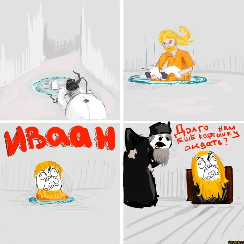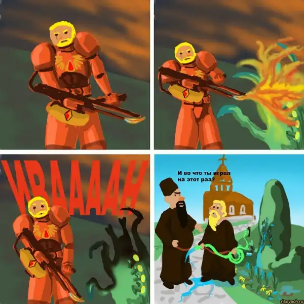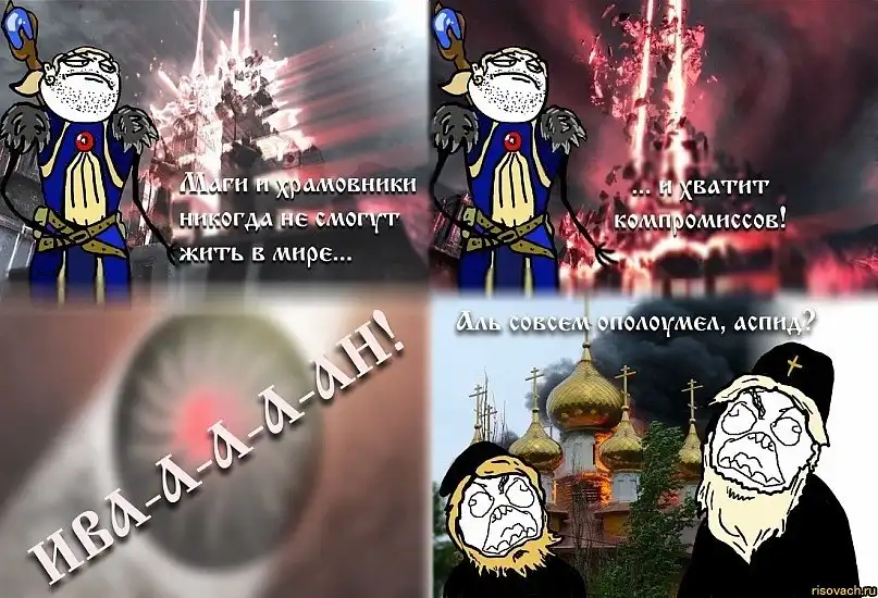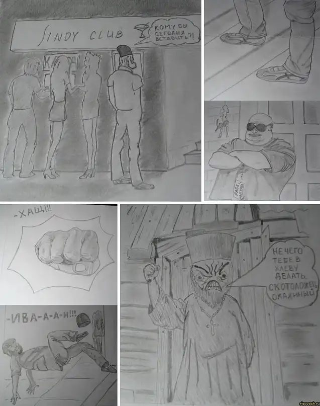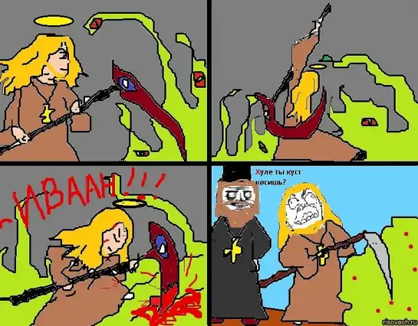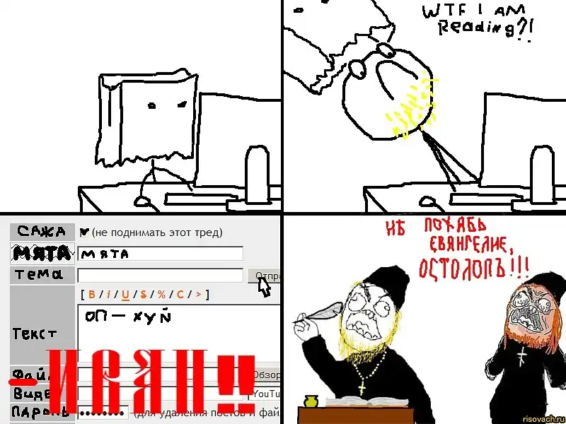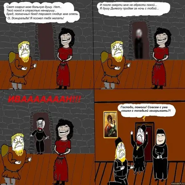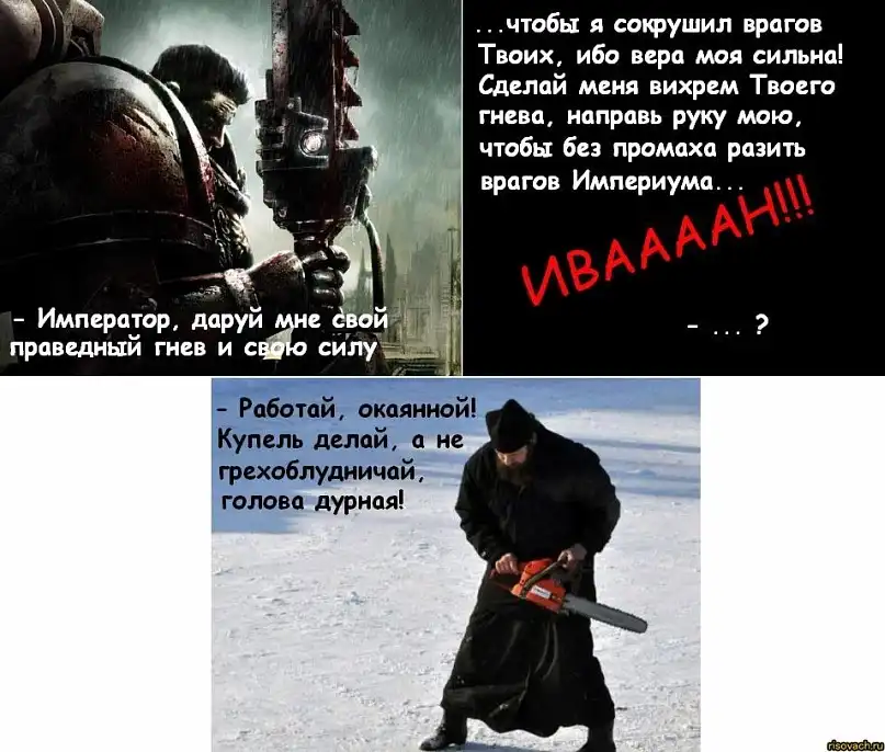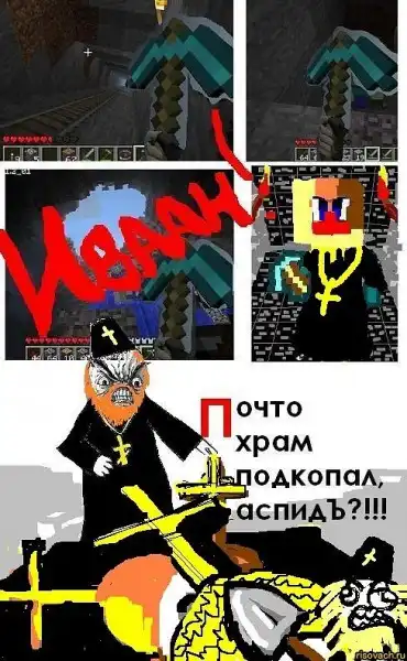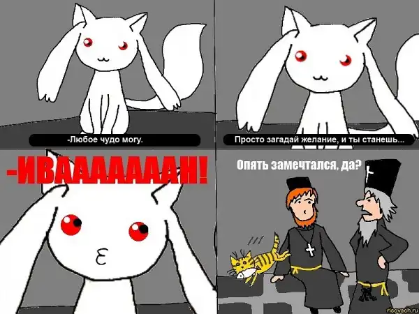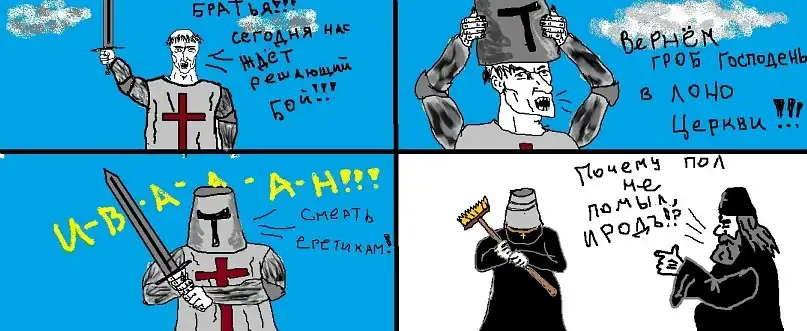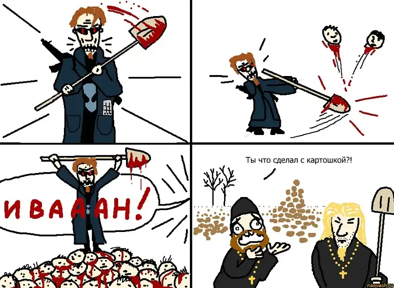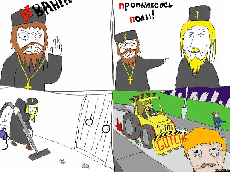 Иван! — послушник, который постоянно фантазирует и представляет себя в роли героев кинофильмов или компьютерных игр (в общем, как ребенок). В предпоследней панели обычно произносится сакраментальное заклинание «ИВА-А-АНЪ», возвращающее его в реальность.