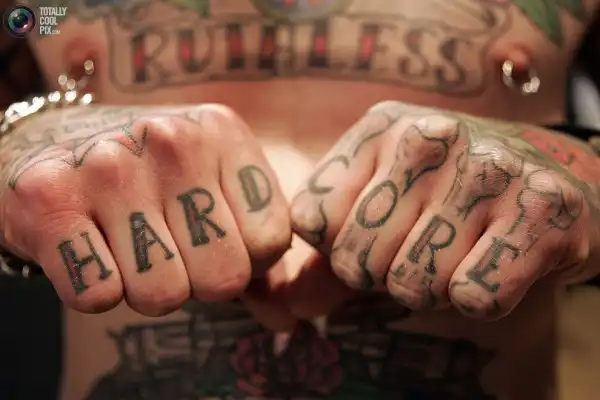 Майк Карри демонстрирует татуировки, которыми украшены его пальцы. 9-я ежегодная Тату-Конвенция в Нью Йорке, 20 мая 2006 года.