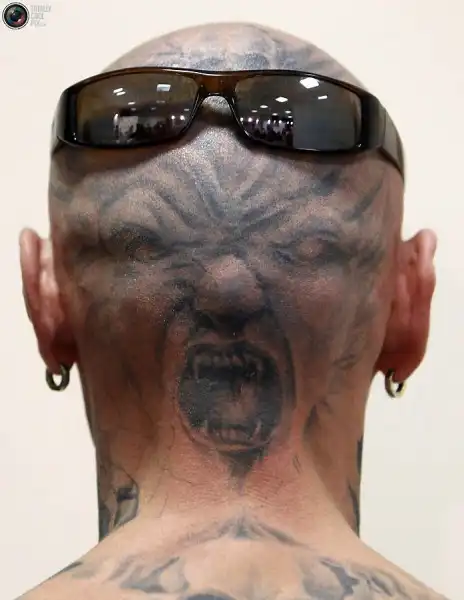 Неизвестный мужчина из Будапешта демонстрирует татуировку на затылке во время 13-й Международной тату конвенции, которая прошла во Франкфурте 8 мая 2005 года.