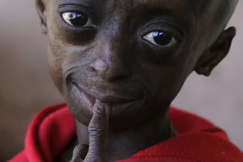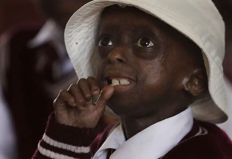 Двенадцатилетняя Онтламетсе Фалатсе в своем доме в Хевроне, недалеко от Претории, ЮАР. 12-летняя Фалатсе, напоминающая стареющую женщину, единственный темнокожий ребенок, родившийся с очень редким заболеванием.