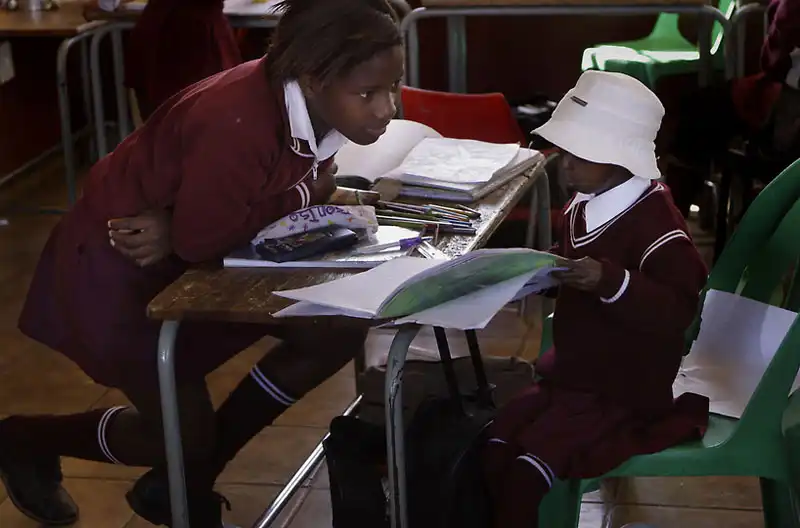 12-летняя Онтламетсе Фалатсе со своей лучшей подругой Катлего Матабе перед уроком в школе Лорато в Хевроне.