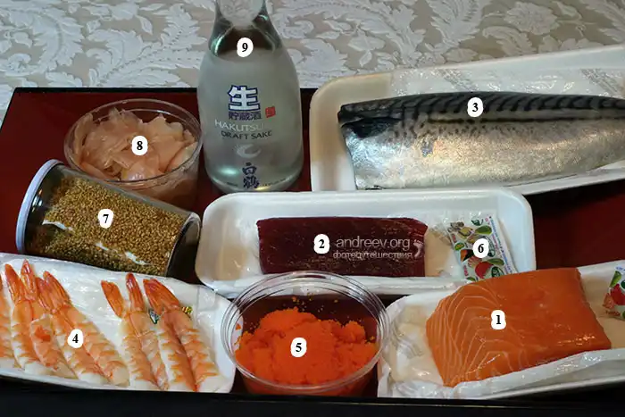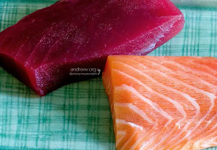 Сырая свежая рыба: филе лосося (саке) и тунца (магуро). Рыба ни в коем случае не должна быть ни разу заморожена! Желательно покупать специально предназначенную для суши в японских магазинах, с пометкой "sushi grade".