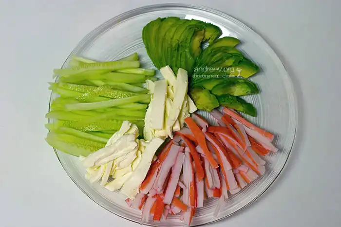 Начинка для роллов, произвольная комбинация. Например, крабовые палочки, полоски авокадо, огурца, сливочного сыра. Дополнительно можно использовать специальный японский майонез (обычный слишком резкий).