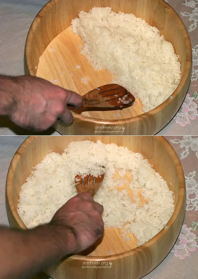 5. Соединение заправки с рисом. Горячий рис выложить в широкий контейнер ровным слоем, вылить на него заправку тонкой струйкой по лопатке, и незамедлительно начать мешать. Поднимать рис деревянной лопаточкой снизу вверх и справа налево. Собрать весь рис на половину контейнера, и потихоньку начать переправлять его небольшими порциями на другой край, делая горизонтальные, режущие (не размешивающие!) движения деревянной лопаткой. Такое бережное обращение позволит пропитаться заправкой каждому рисовому зернышку. Повторить так несколько раз. Распределить рис равномерным слоем по дну контейнера. Накрыть влажным бумажным полотенцем, и оставить охлаждаться.