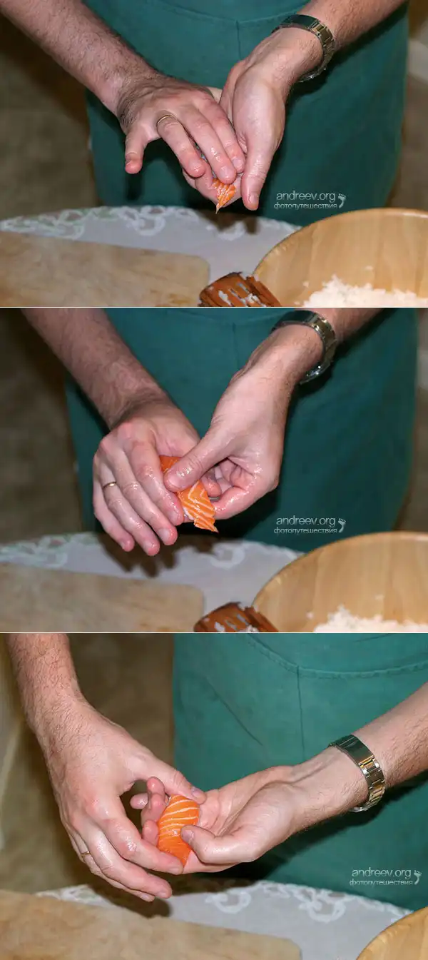 Указательным пальцем правой руки зачерпните немного васаби (не выпуская рисовой заготовки из ладони), и слегка промажьте кусок рыбы. Поверх положите рис. Большим пальцем левой руки слегка нажмите на рис сверху, оставив почти незаметную вмятинку. Теперь смените руки, и надавите более сильно на всю поверхность риса указательным и средним пальцами правой руки.