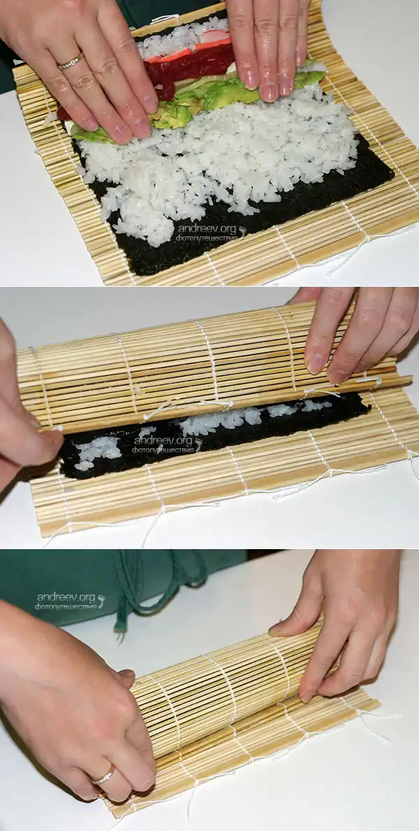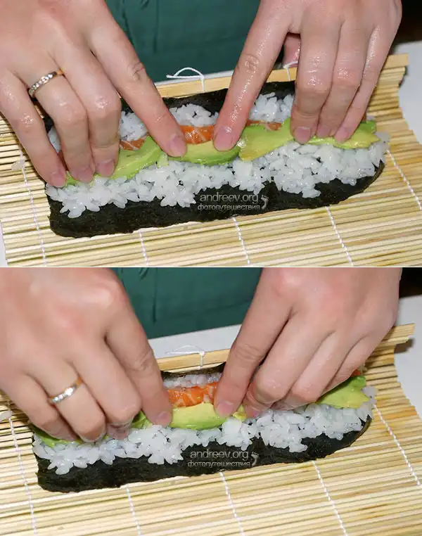 Удерживая все ингредиенты, поднимите край коврика с помощью больших пальцев, и продолжайте поднимать его вверх и вперед, пока край коврика не коснется противоположного края водоросли. Затем, загните край коврика наверх, и "докатите" ролл вперед. Слегка сожмите его внутри коврика, придавите пальцами с торцов, если выпал рис. Отложите на гладкую поверхность, и приступайте к изготовлению следующего.