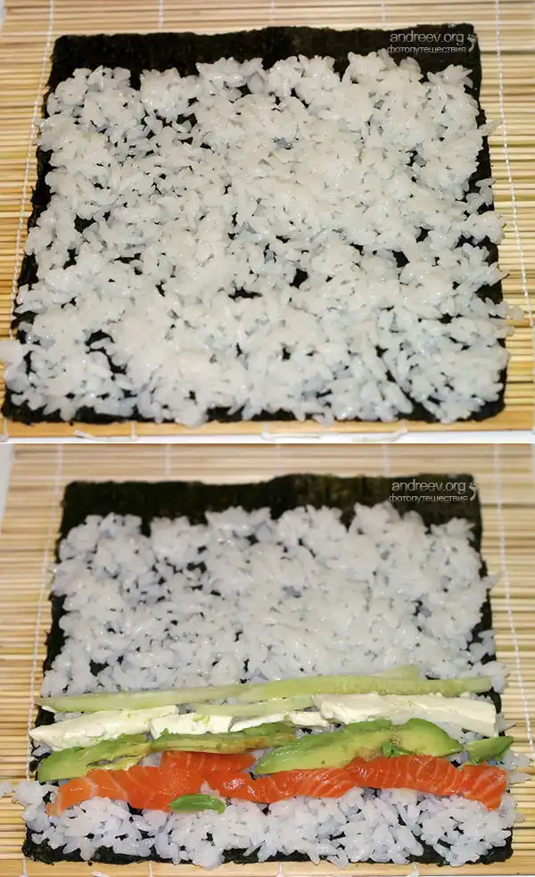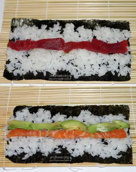 Начинайте выкладывать ингредиенты, отступив от нижнего края 1,5-2 см. Никогда не кладите начинку одну на другую, только рядом, полосками, двигаясь к центру водоросли.