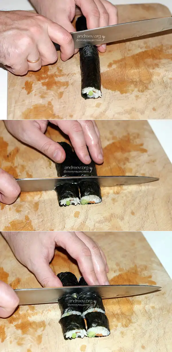 3. Как разрезать роллы. Возьмите острый нож, окуните его кончик в уксусную воду. Затем, поверните его острием вверх, так чтобы вода пробежала по всей поверхности ножа и равномерно смочила его. Это позволит ножу легко пройти сквозь липкий рис, не застряв в нем.