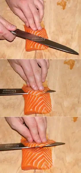 Вам понадобится очень-очень-очень острый нож. Нарезка осуществляется одним движением по дуге к себе. Ни в коем случае нельзя "пилить" сквозь рыбу! Естественно, рыба должна быть без кожи, желательно - лучшая часть филе. Если филе не плотное, отрезаемый фрагмент можно сделать потолще. Чем рыба плотнее, тем тоньше должна быть нарезка.