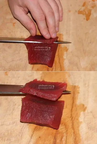 Желательно взять рыбную заготовку прямоугольной формы, около 10 см в длину и 2,5 в высоту. Отступите от левого края 0,5-1,5 см (в зависимости от плотности рыбы), и расположив нож под углом в 45 градусов к поверхности стола, сделайте плавный и быстрый надрез одним махом. Продолжайте разрезать филе в той же манере, параллельно первому надрезу.