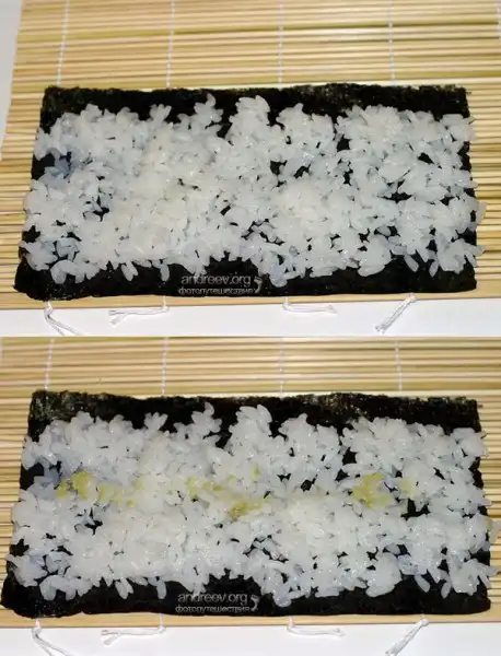 2. Толстые роллы (футо-маки). Толстые роллы, диаметром 5 см, могут содержать до 5 компонентов. Для их изготовления возьмите целый лист водоросли, положите на коврик блестящей стороной вниз. Смочите руки уксусной водой и равномерно распределите рис по водоросли, оставив с верхней стороны свободными около 2 см. По желанию, промажьте рис неострым майонезом.