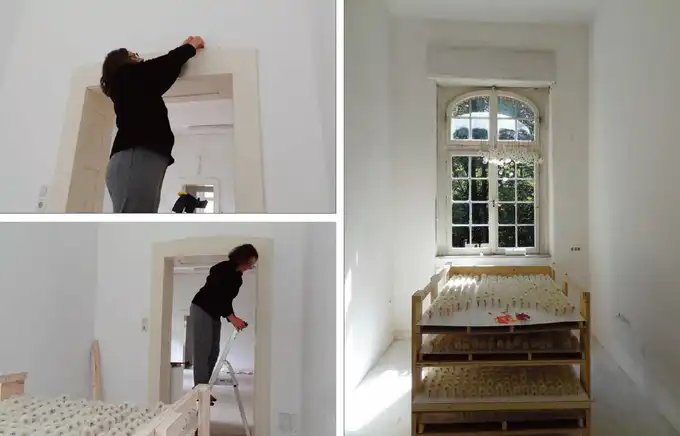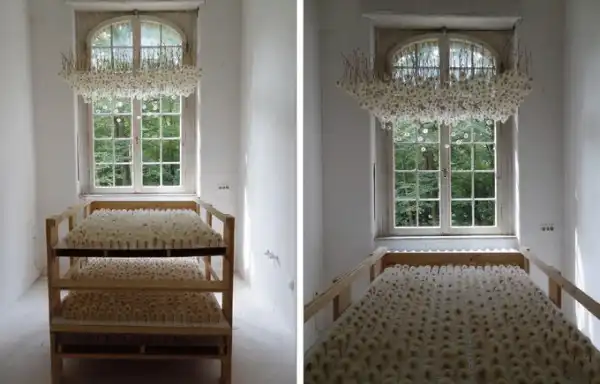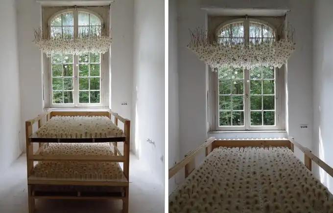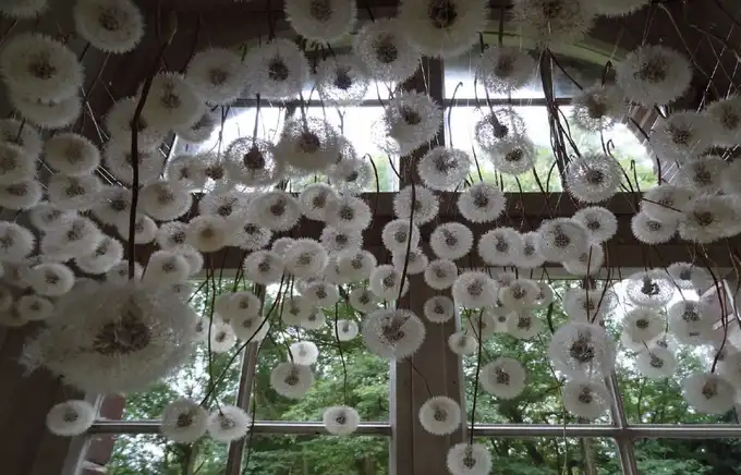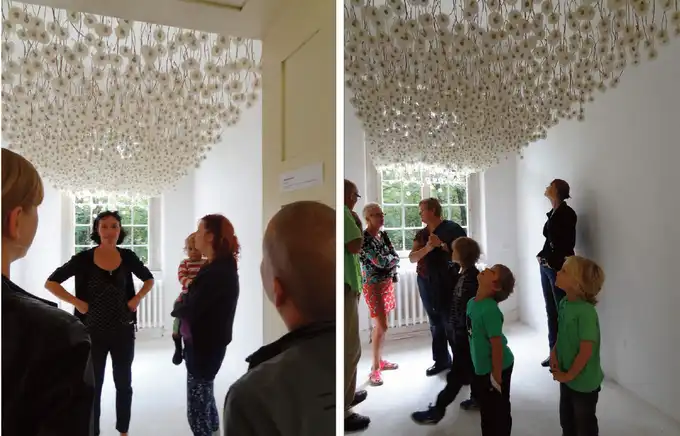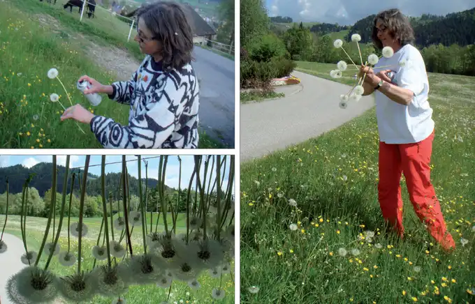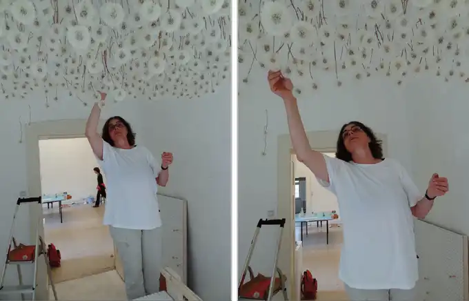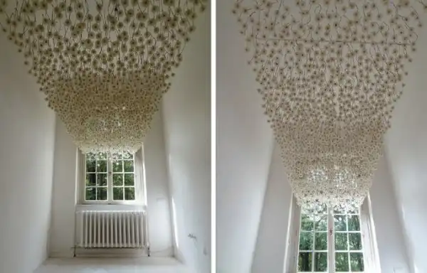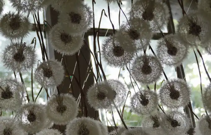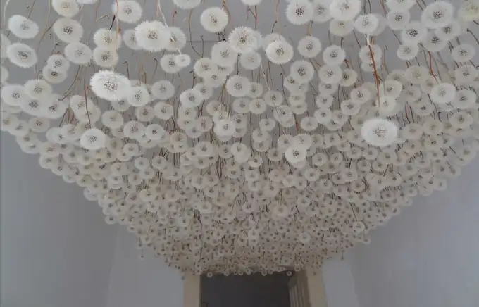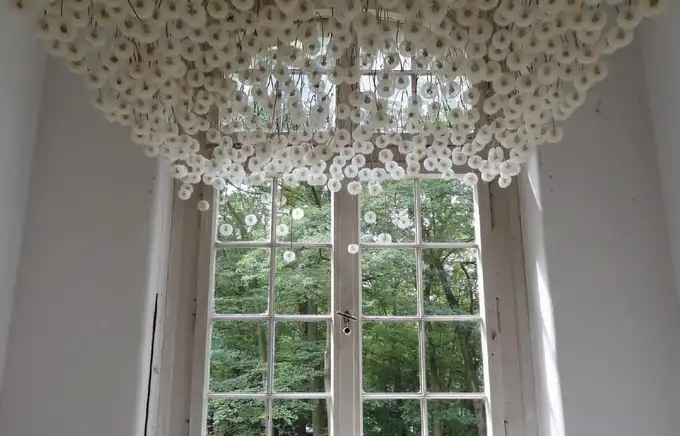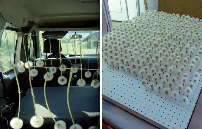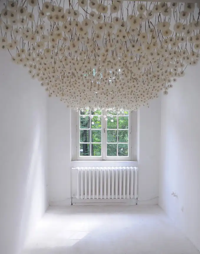 Удивительную инсталляцию сделала немецкая художница Regine Ramseier. Она подвесила за стебли нетронутые одуванчики. На это ей понадобилось около 2000 цветков.