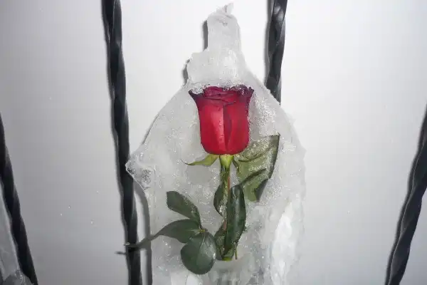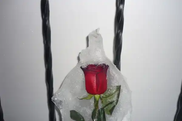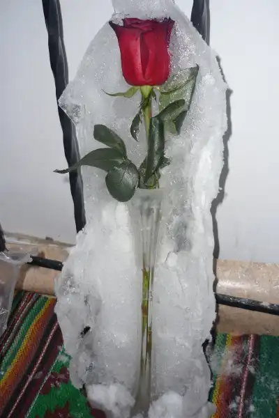 что бы лёд был прозрачный нужен либо рефрижератор либо очень много нервов и времени , плюс отличная холодоустойчивость ))) обратите внимание что роза не тупо заморожена или вморожена в этот кусок льда а стебель находится в вэтаком тунельчике ) так что роза долго простоит )))
