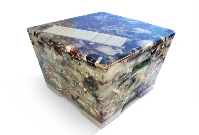 Для изготовления подобной мебели автор использует эпоксидную смолу и расплавленный алюминий. Смешанную консистенция заливается в форму, наполненную старыми деталями от электронной техники.