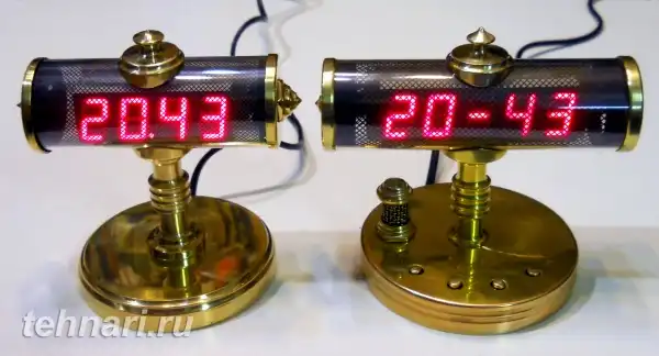 Отличий не очень много: добавились кнопки, боковины пришлось сделать сетчатыми для выхода звука будильника, и на подставке появился отсек для датчика температуры, он тоже сделан из сеточки. Часы могут показывать домашнюю и уличную температуру, имеют пять будильников и календарь.