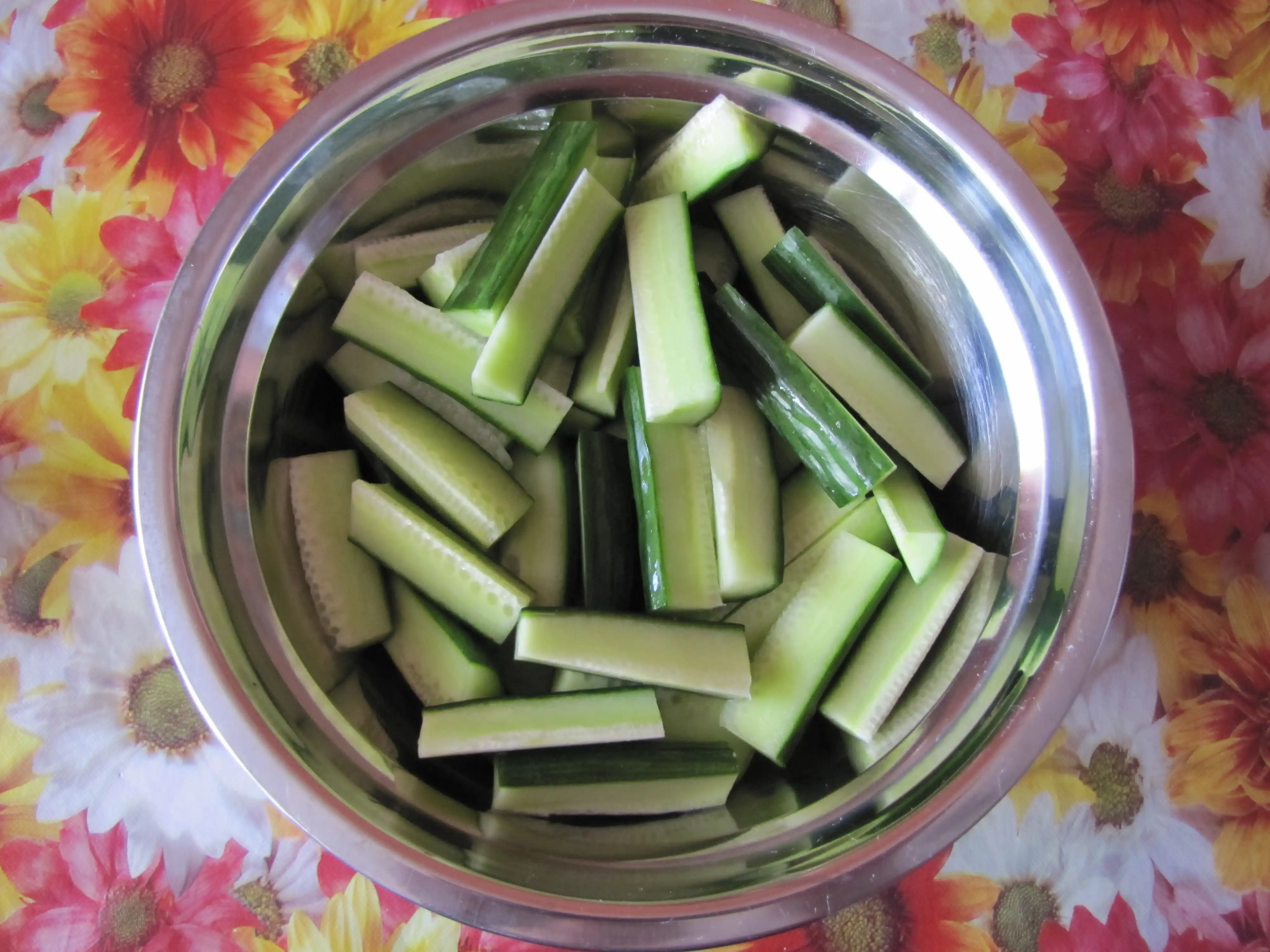 Пока маринуется мясо, готовим закуску. Огурцы моем и режем как показано на рисунке ниже.