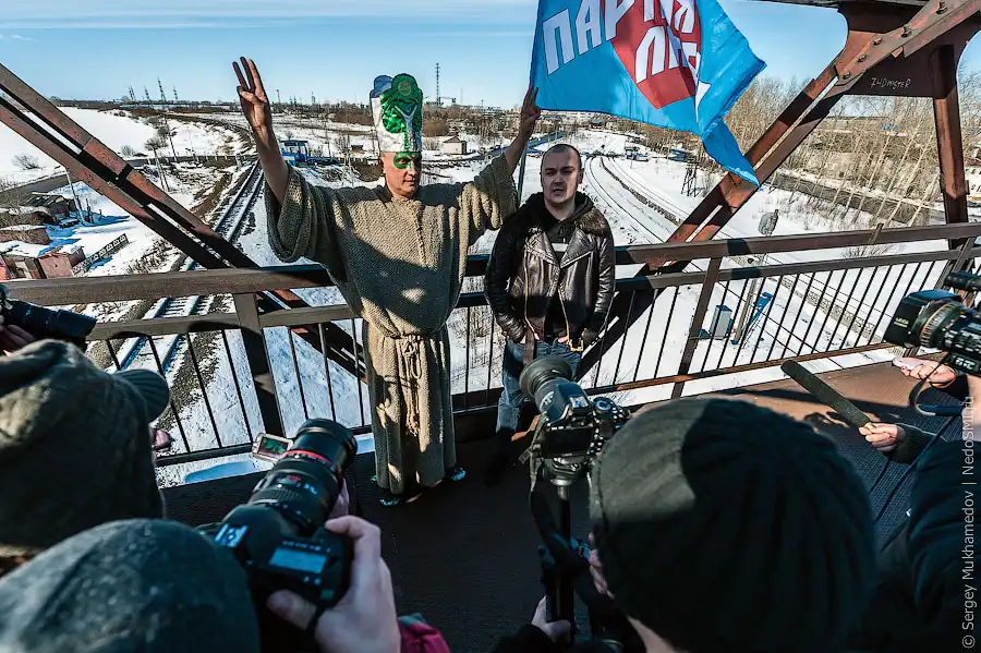 Недавно Древарх Просветленный стал руководителем архангельского отделения "Партии любви" и сегодня открыл ее учредительный съезд на железнодорожном мосту.