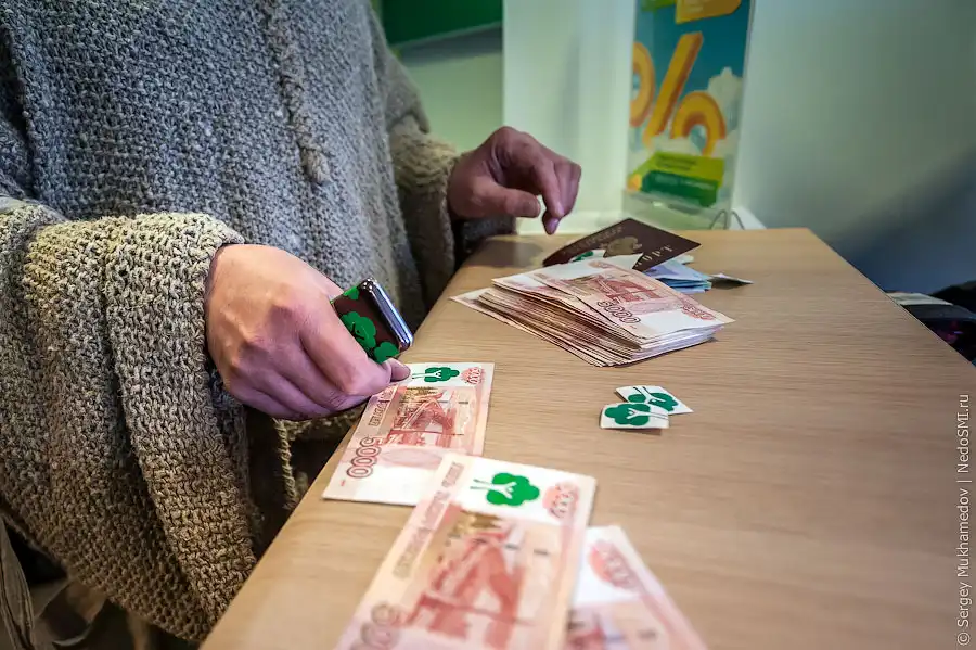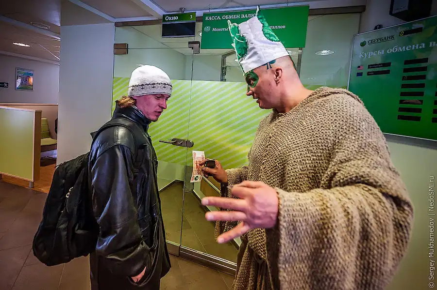 Оказавшись в банке, я понял всю прелесть быть фриком - для тебя не существует очередей. Древарх, рассказывая посетителям про вселенскую любовь и деревья, легко проходит без очереди, даже умудрившись выставить бабушку из закрытой кабинки кассы - связываться с таким не хотят даже охранники. Он привычно прилепляет в помещении ко всем сбербанковским логотипам свои "деревца", а потом, разложив на стойке полученную толстенную пачку пятитысячных, начинает "работать" над купюрами.