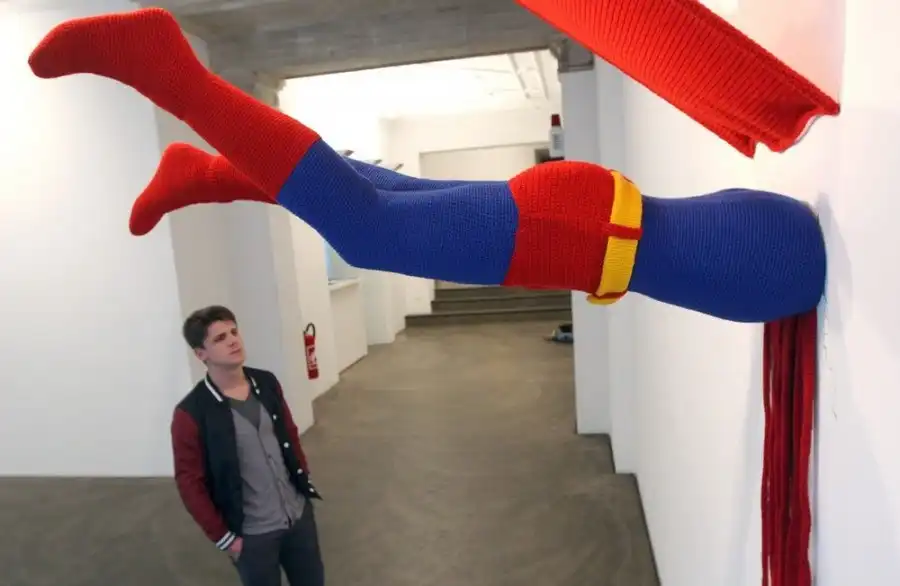 Вязаная скульптура «Супермен». Персонаж комиксов, наделенный сверхчеловеческими способностями, в своем последнем полете несколько не рассчитал траекторию.