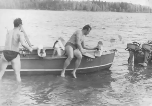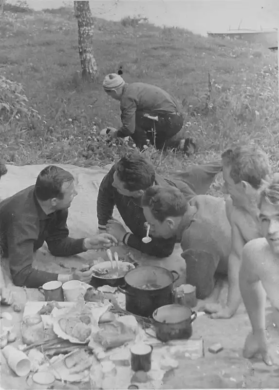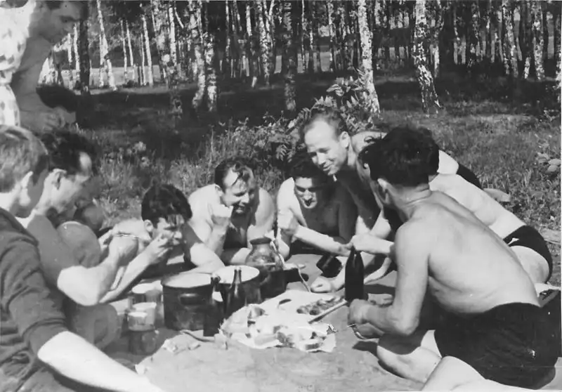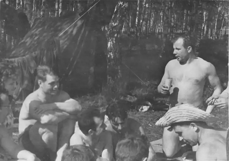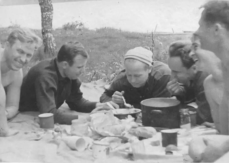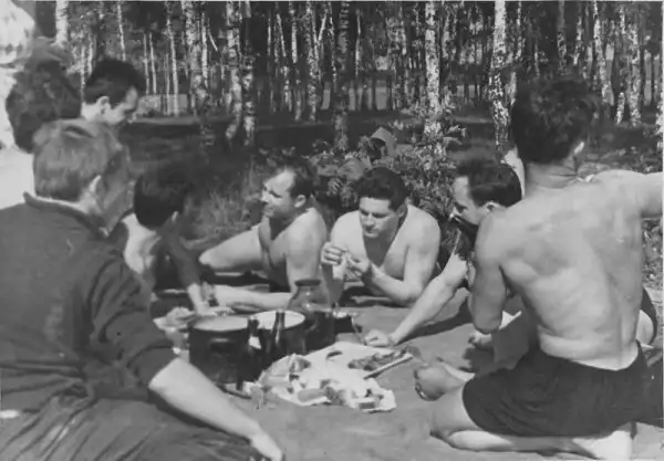 Первые космонавты СССР: Юрий Гагарин, Алексей Леонов, Борис Волынов, Виктор Горбатко – на пикнике в Долгопрудном.19 августа 1963 года.