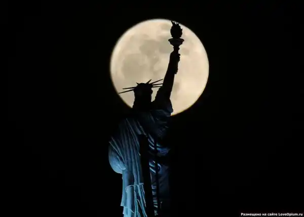 Суперлуние 2012 в Косово. На переднем плане — копия статуи Свободы на крыше отеля «Виктори»: