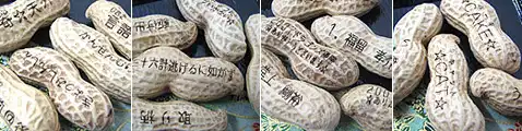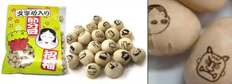 Бобы с изображениями японских божеств, которые вроде как приносят удачу (фото с сайта arigatou3.com).
