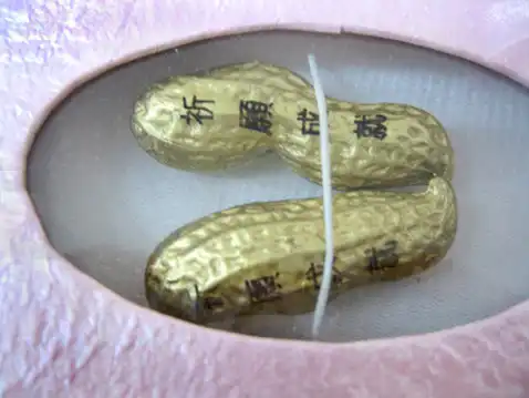 Пара орешков арахиса для свадебной церемонии. Благодаря надписям на них молодожёны всегда смогут легко вспомнить имена друг друга (фото с сайта arigatou3.com).