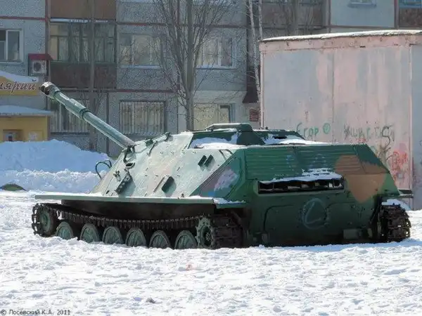 Ещё одна интересная единица бронетехники некоторое время стояла во дворе между домами по ул. Бородина с номерами 10/1 и 12/1. Это авиадесантная самоходная артиллерийская установка АСУ-85