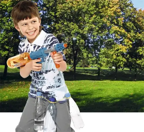 Игрушка работает по принципу пульверизатора: бутылка с водой надевается на длинный шланг, который торчит из задней части автомата. Чтобы выстрелить, нужно передернуть затвор. Р-р-р-раз, и мама мокрая с головы до ног!
