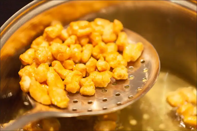 11. Чуть прибираем температуру нагрева и небольшими порциями обжариваем в масле готовые комочки теста.
