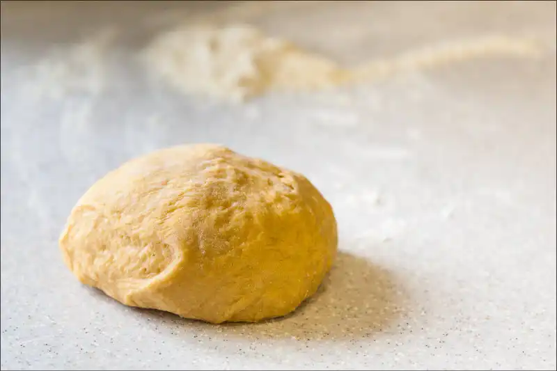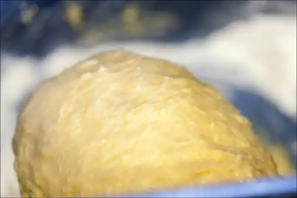 5. Дальше используем блага цивилизации и перемещаем тестовую заготовку в тестомешательную машину. По мере замеса добавляем муку. Муки может потребоваться меньше, чем у меня, или больше. У разной муки разная степень взязкости. Тесто должно получиться чуть мягче, чем как на пельмени – густое, нелипкое, пластилинообразное.