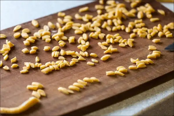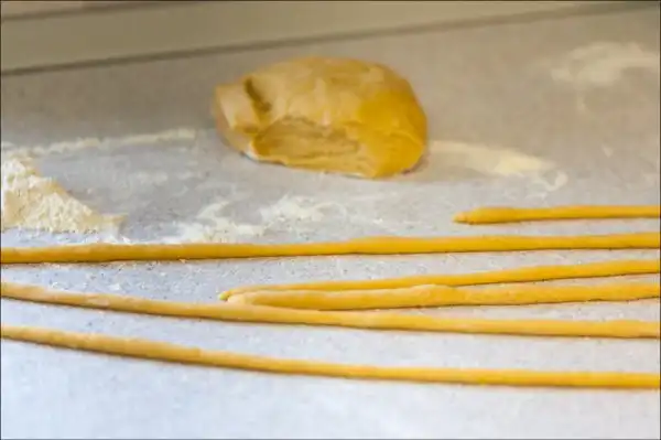 7. Из полученного колобка, пока он и от бабушки, и от дедушки не ушёл, отделяем порции, размером с куриное яйцо и раскатываем на тонкие макаронины. Тесто без воды очень непослушное и раскатывается с нежеланием