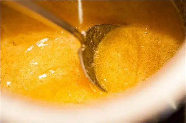 16. Обмазывать чистым мёдом готовые шарики не есть хорошо. Мёд через пару часов весь стечёт на дно тарелки и получится фигня. Чтобы придать мёду густоту и карамелизацию, мы ставим его на медленный огонь и засыпаем сахар. Постоянно помешиваем. Кто сомневается в своих силах – пользуйтесь паровой баней.
