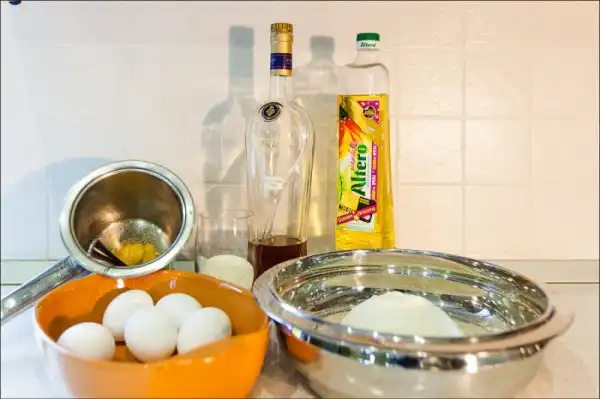 1. Чак-чак прост и изготовлении и требует минимум продуктов. Берём пять куриных яиц, пол-килограмма пшеничной муки, большую столовую ложку коньяка, семьсот миллилитров растительного масла, полтора стакана мёда, треть стакана сахара и полтора часа свободного времени.