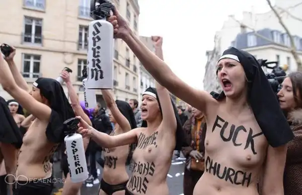 Допрыгались девахи во Франции... Там прошли многотысячные митинги против легализации однополых браков. И тут феменши полуголые крайне неудачно повылазили с лозунгами провокационными. Попинали их немножко политкорректные католики. Полиция спасла.