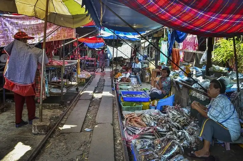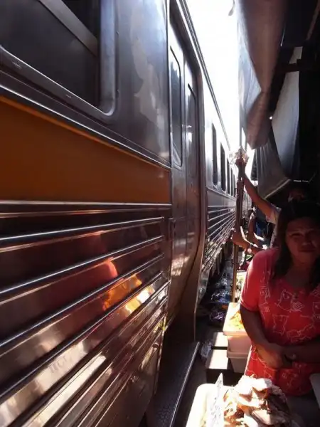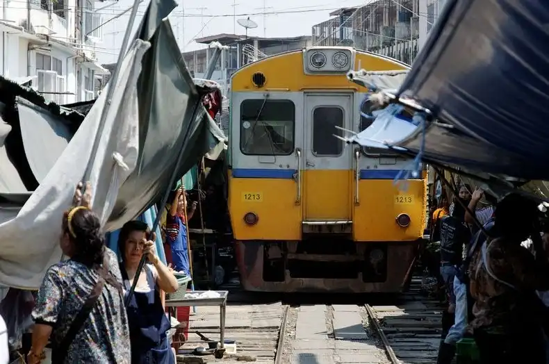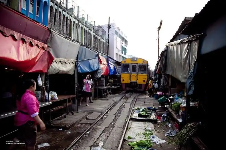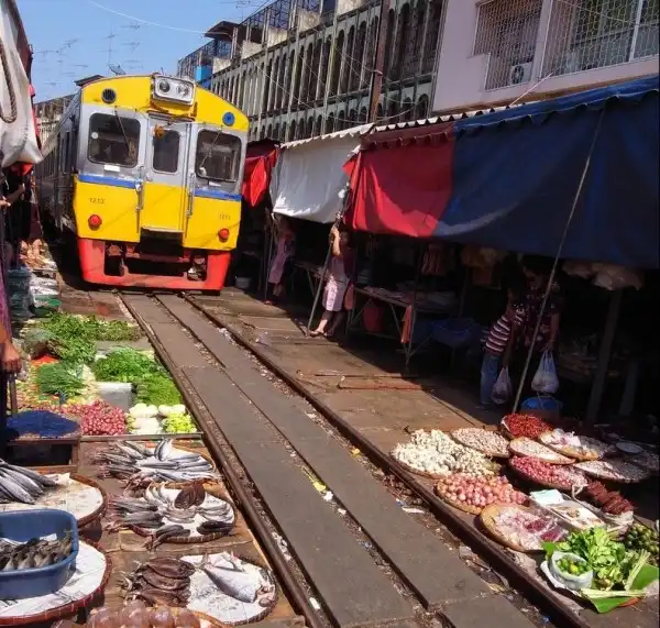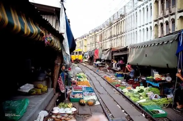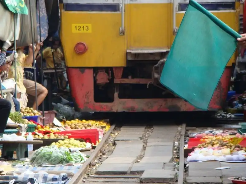 В небольшом тайском поселении Самут Сонгкхрам, недалеко от Бангкока, находится железнодорожный рынок. Нет, это не рынок, где можно купить запчасти к составам, вагонам или сами вагоны. Это обычный рынок, на котором продаются тропические фрукты и овощи, здесь также полно сушеных специй, соусов и трав, свежих морепродуктов и других местных деликатесов. Кругом навесы, зонтики, мало места, все толкаются. И тут вы замечаете под ногами железнодорожные рельсы. А потом раздается громкий гудок, и рынок тут же оживает. Покупатели стараются уйти с пути, а продавцы – убрать свои товары, разложенные прямо на рельсах. Это странное и необычное зрелище – поезд, едущий со скоростью в 24 км/час, практически задевает фрукты и овощи, а продавцы в это время держат подпорки своих лотков.