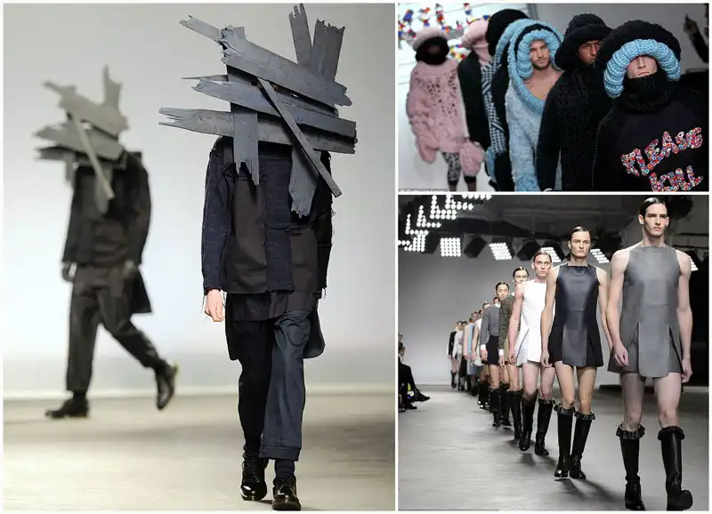 Лондонская Неделя мужской моды (Men’s Fashion Week) в этом году была забавной, если не диковинной. Трехдневное мероприятие в первый же день шокировало публику щитами из досок, которыми были прикрыты лица моделей. В дальнейшем дизайнеры, как кажется, состязались друг в сумасшествии.