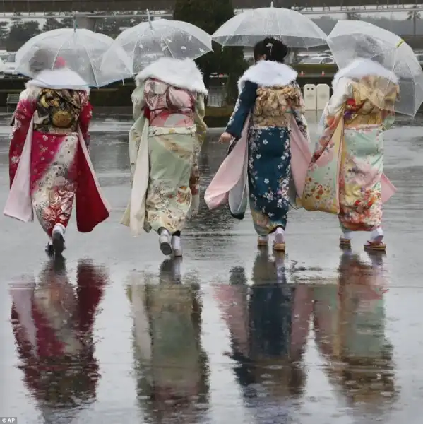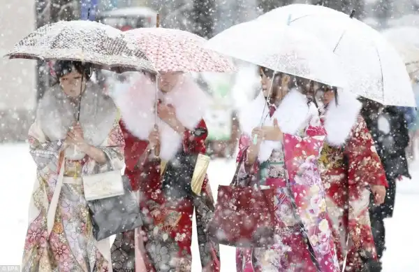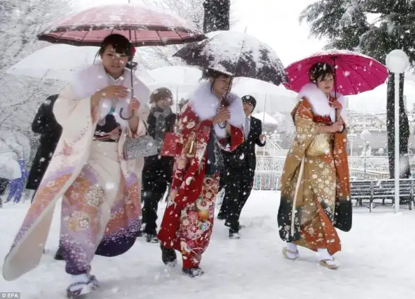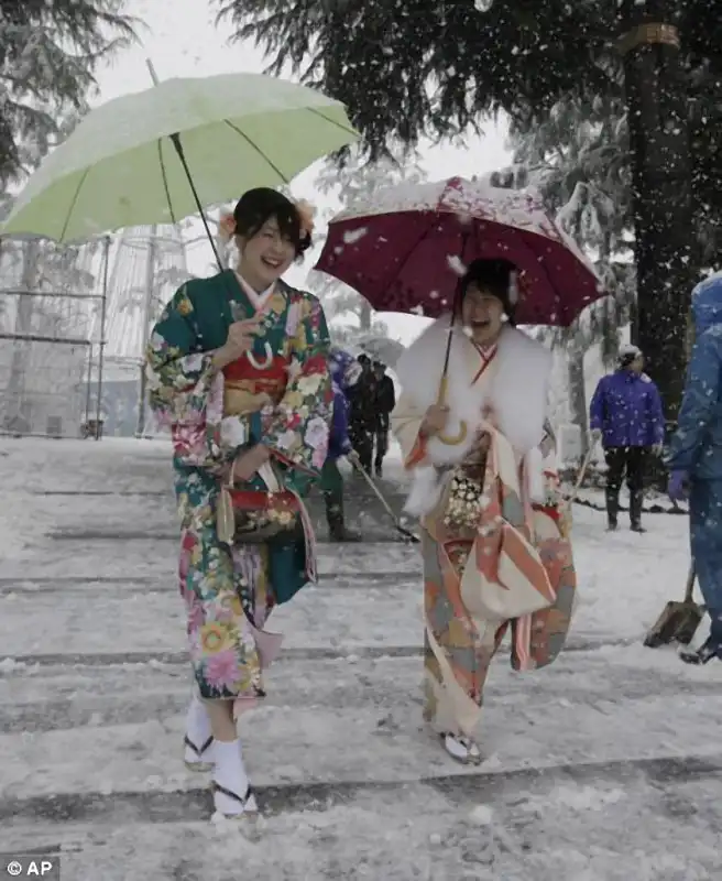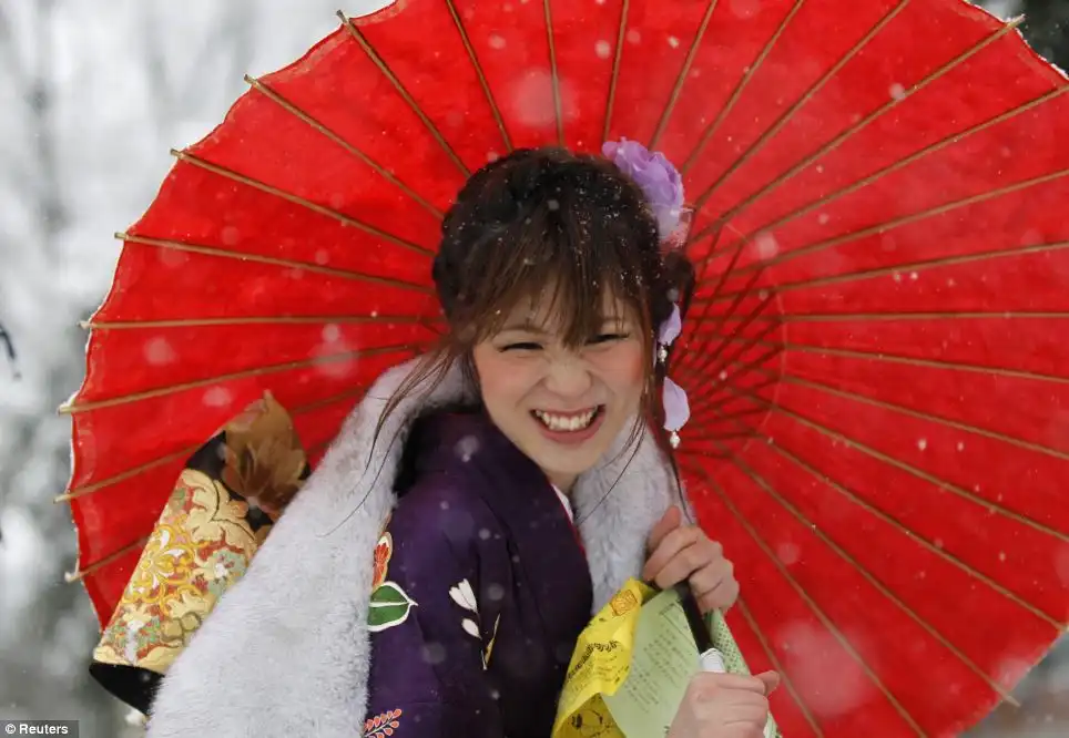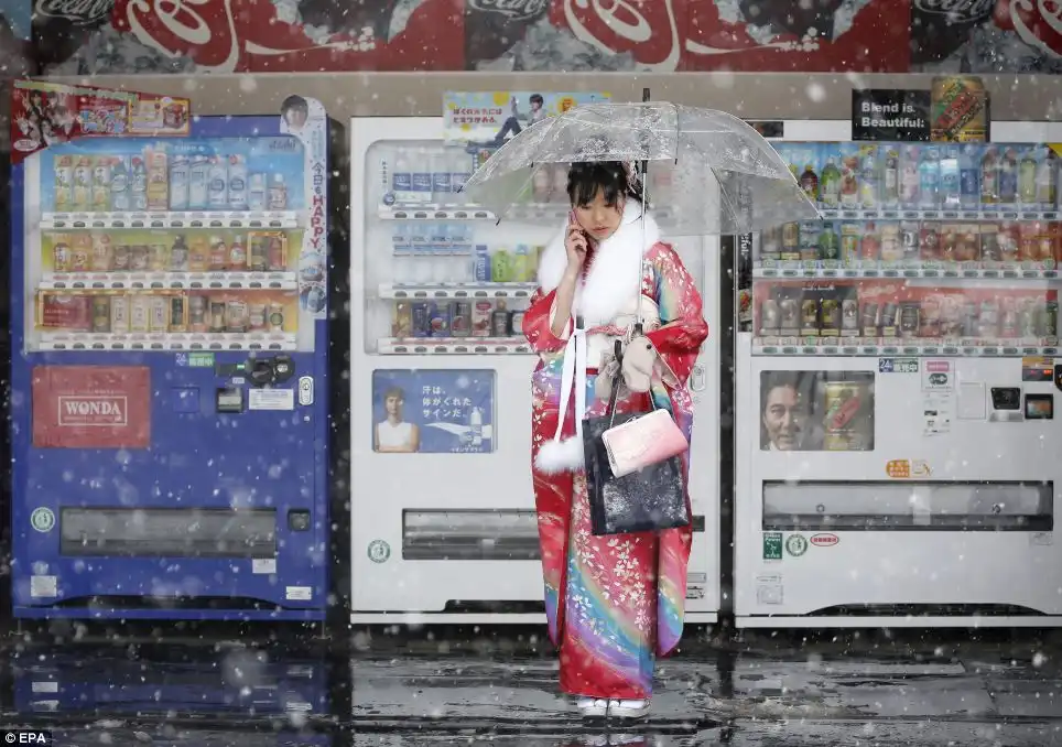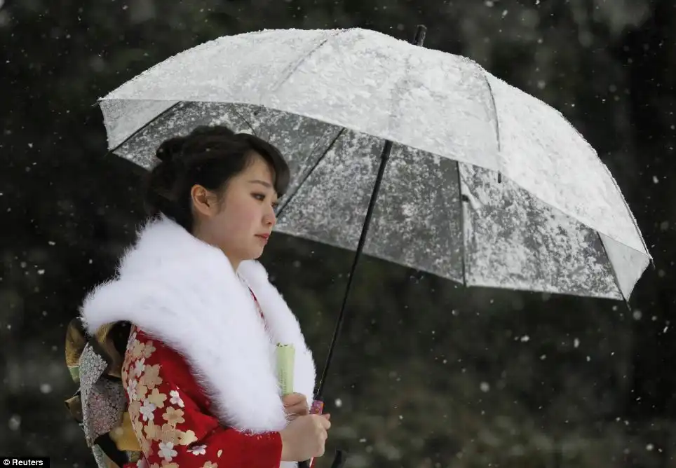 Движение перекрыто: Рейсы в столичном аэропорту Ханэда отменены, скоростные магистрали частично закрыты, а отправление поездов откладывается из-за снегопада. Но девушек в кимоно это не останавливает.