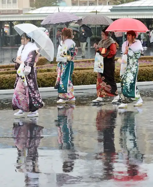 Навстречу новому периоду: 20-летние японки идут по заснеженному Диснейленду на официальные мероприятия, посвященные дню совершеннолетия.